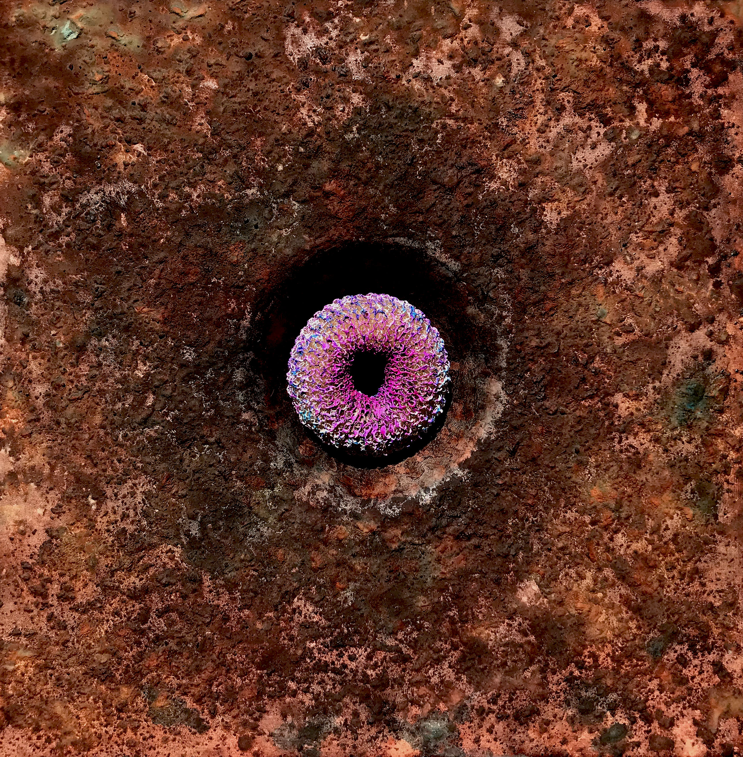 This mixed-media artwork features a striking, multi-colored circular form, resembling a sea anemone, set into a dark, textured hole. The surrounding surface is richly detailed with rust-like and corroded textures, creating a dramatic contrast with the vibrant central element.