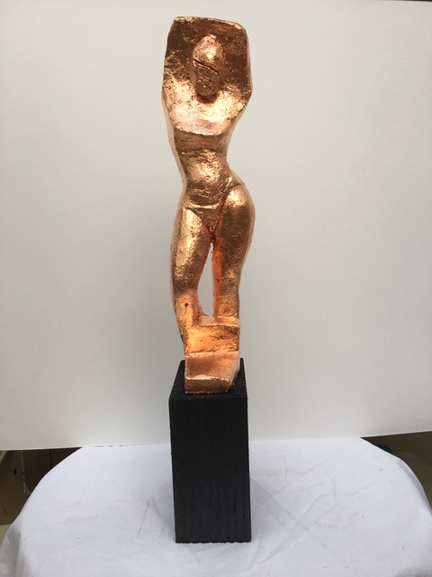 This abstract sculpture features a textured, gold-gilded human figure made from crank clay, symbolizing liberation and self-discovery. Standing prominently on a dark walnut base, the piece exudes a sense of strength and renewed purpose, with its rough surface highlighting the transformative journey. The warm, metallic glow of the figure contrasts sleekly with the dark, grounding base.