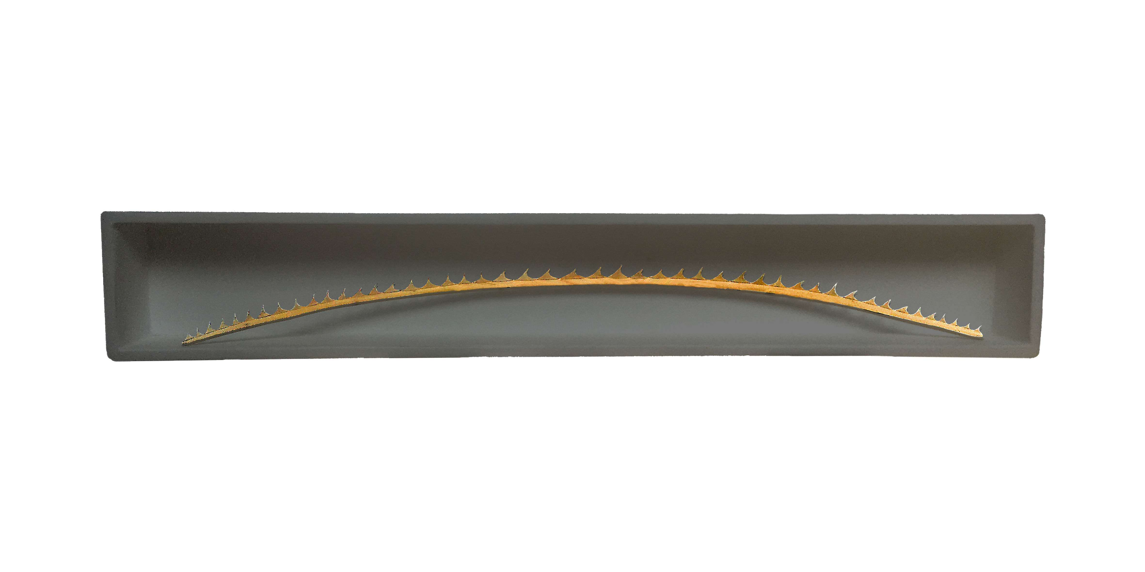 This conceptual sculpture features a thin, slightly curved whittled willow branch adorned with numerous pointed rose hip barbs. The piece is presented within a dark gray, shallow rectangular tray, highlighting the natural textures and the stark contrast between the organic elements and the minimalist display.