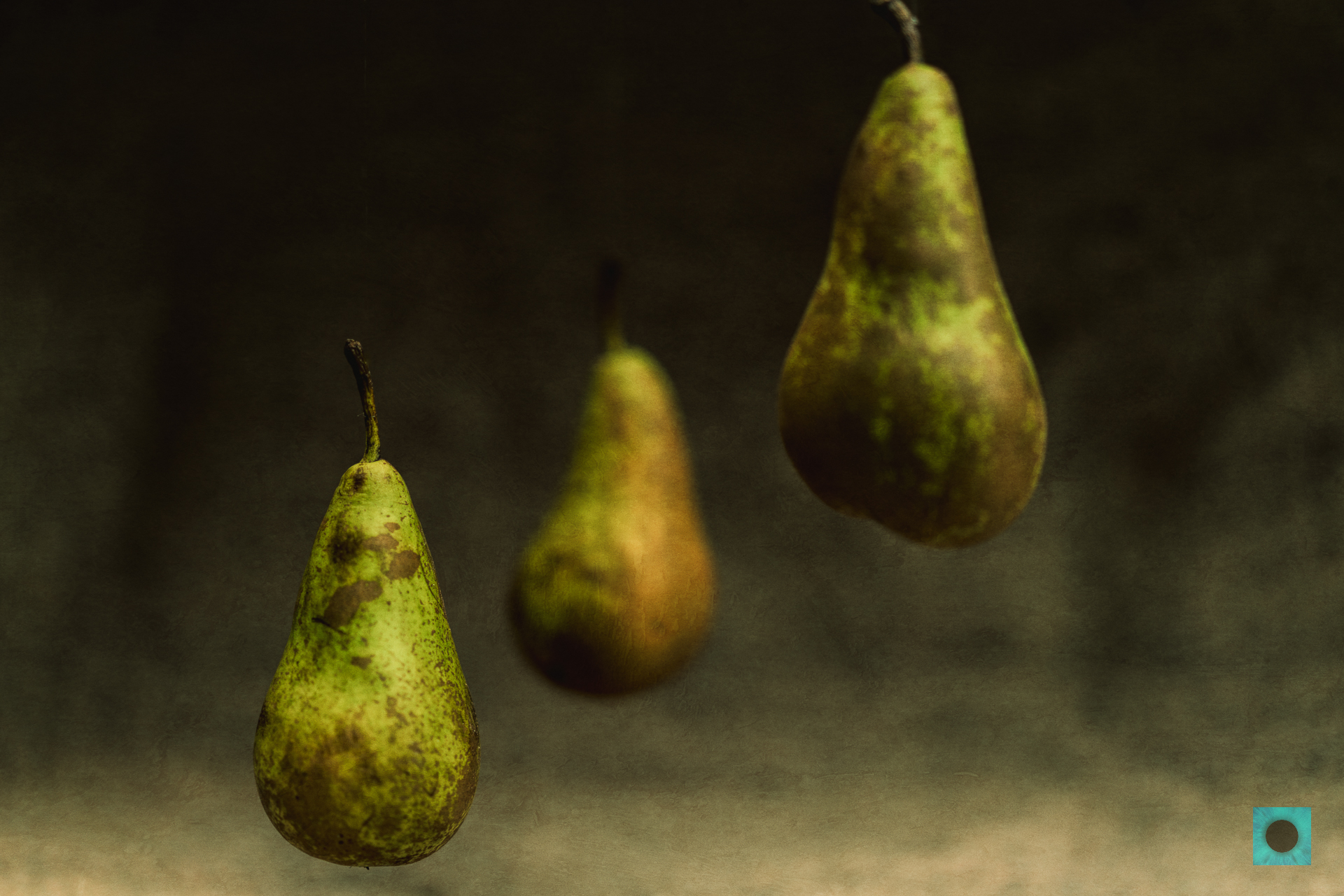This photograph features three ripe pears, displaying variegated greens and soft brown tones, suspended against a dark, textured background. The shallow depth of field keeps the foreground pear in sharp focus while the others recede softly into the background, creating a sense of depth and rustic beauty. The muted lighting enhances the organic textures of the fruit and the moody atmosphere of the composition.